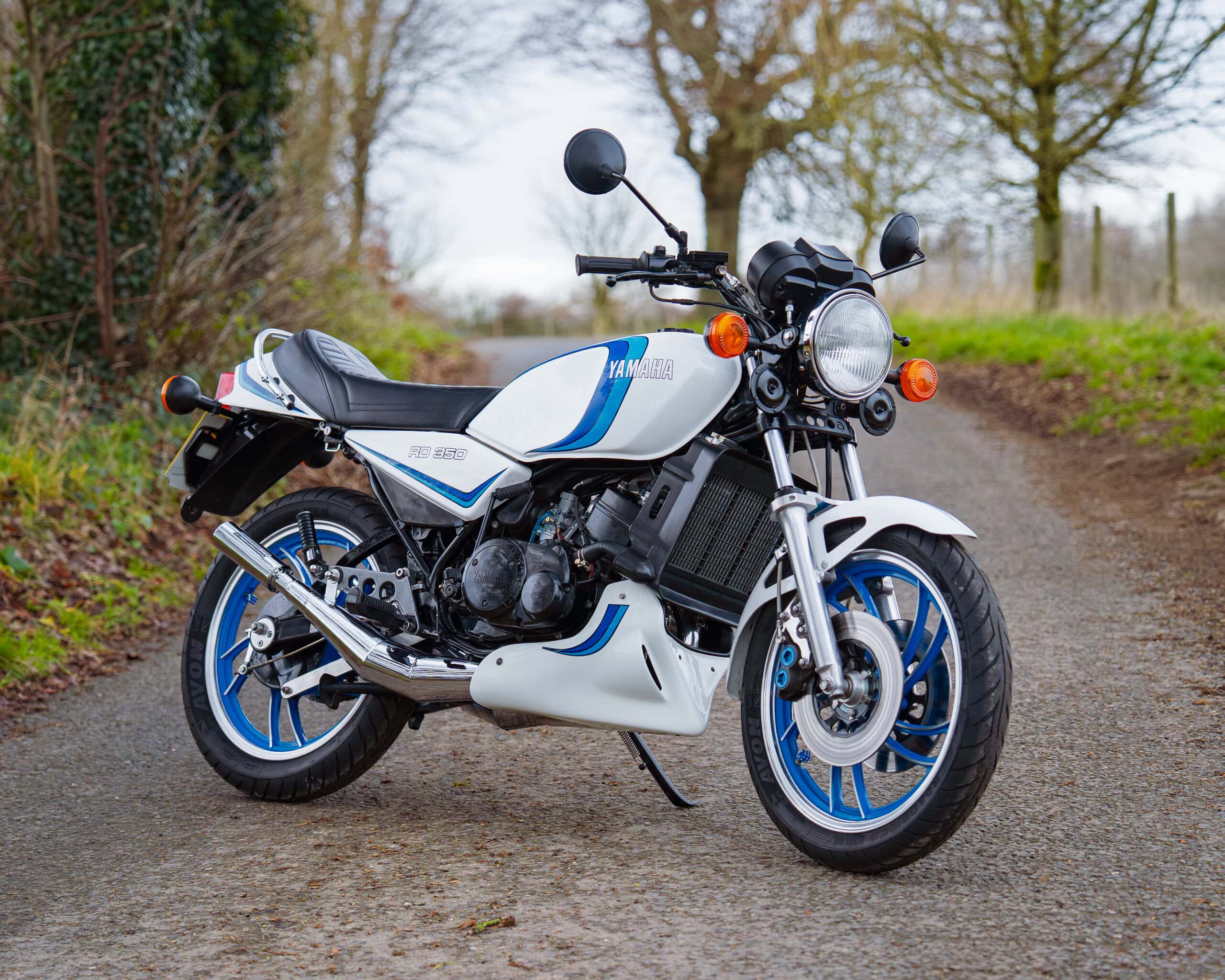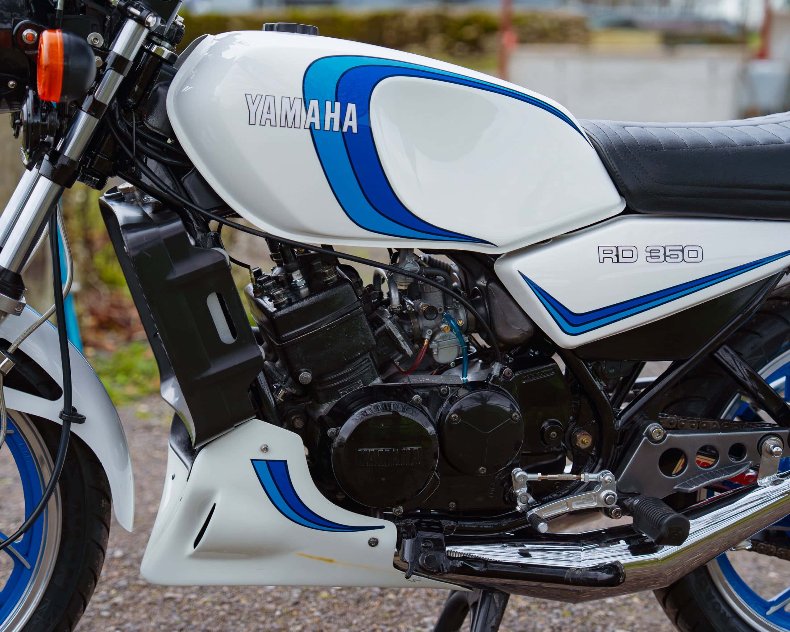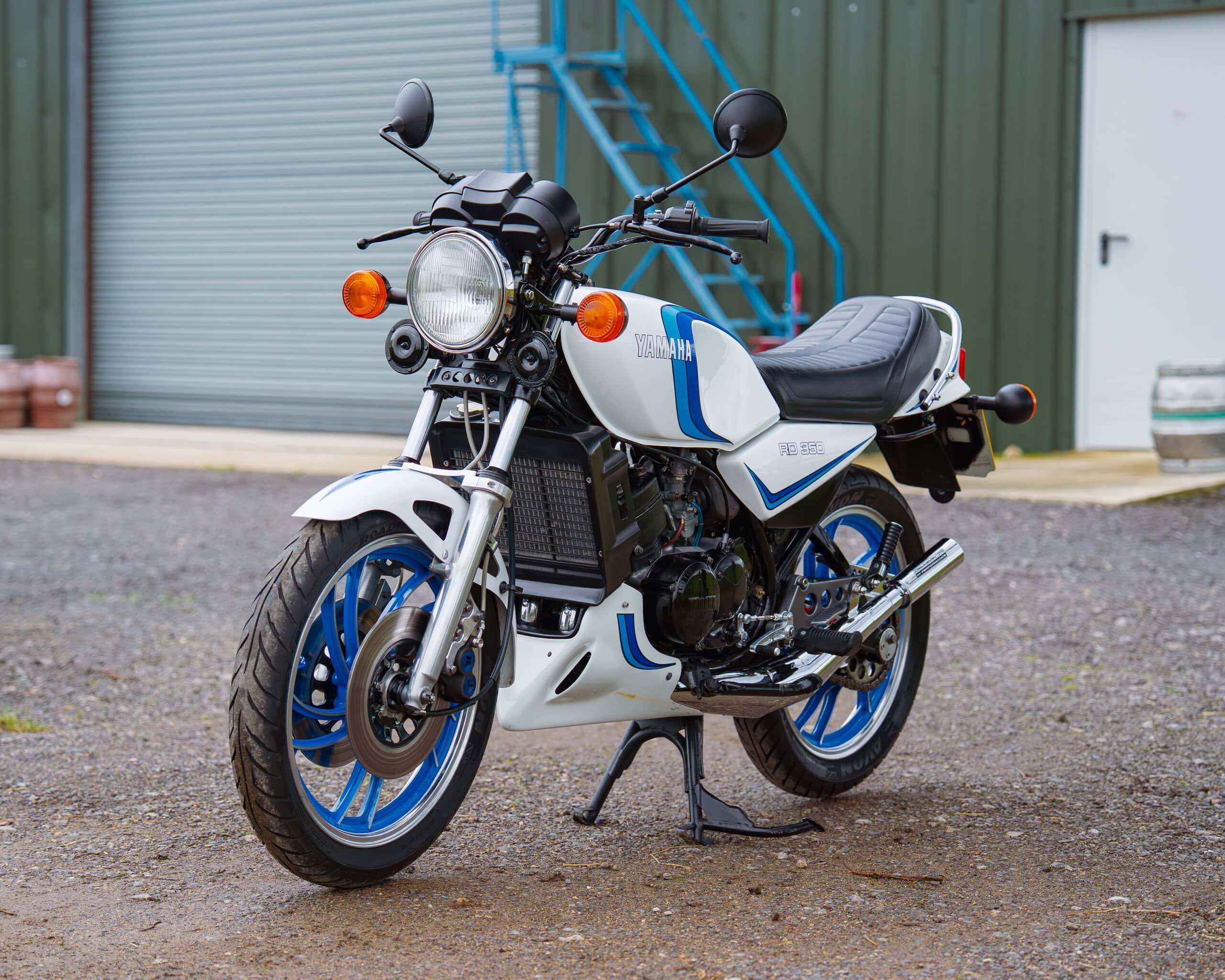A lovely example of the iconic 1981 Yamaha RD350LC, fully rebuilt in 2013 with key electrical components renewed, including a new wiring loom, ignition coil, and CDI unit. This LC presents beautifully in the sought-after Bounty white-and-blue colour scheme, complemented by striking blue-painted wheels for a proper period look.