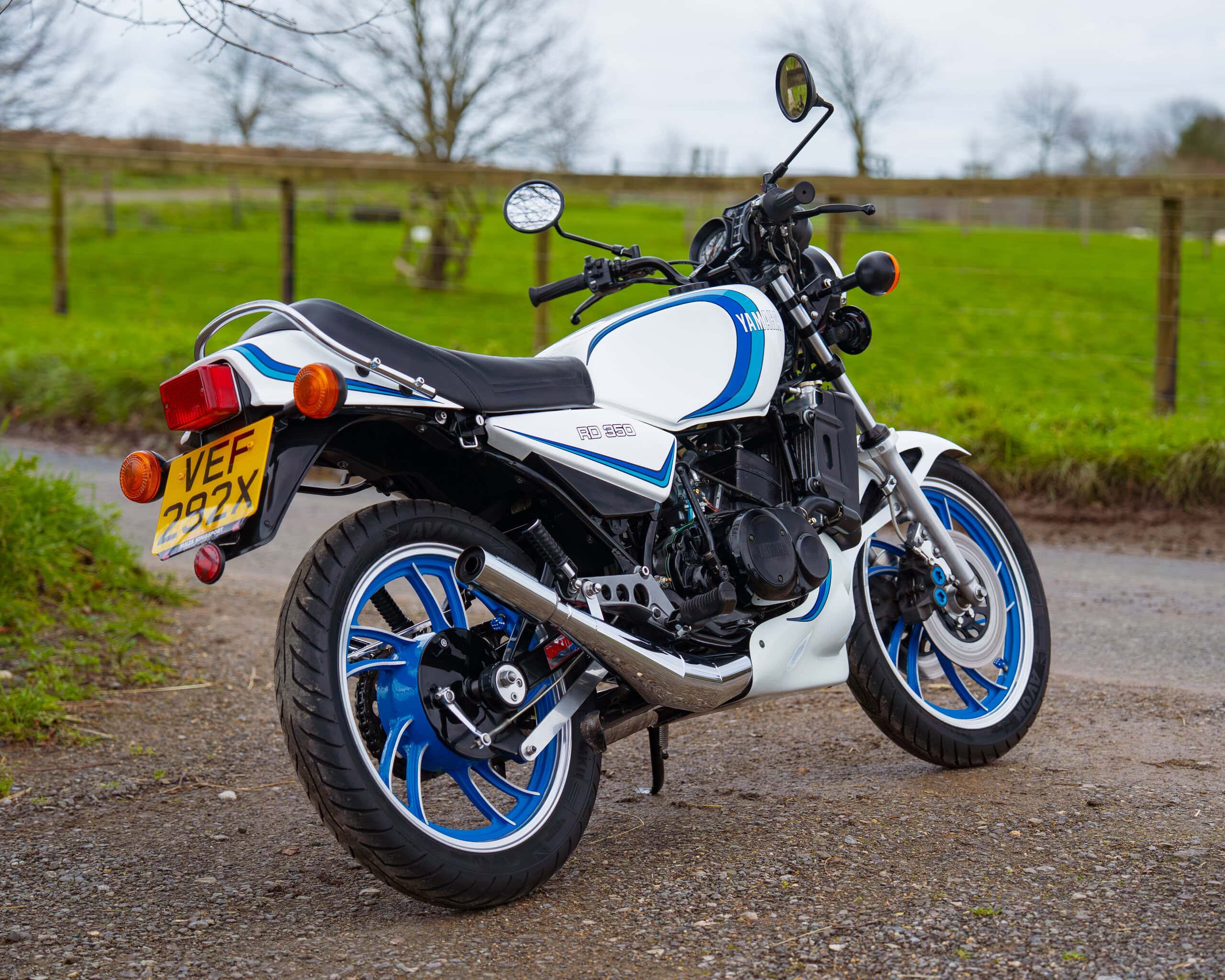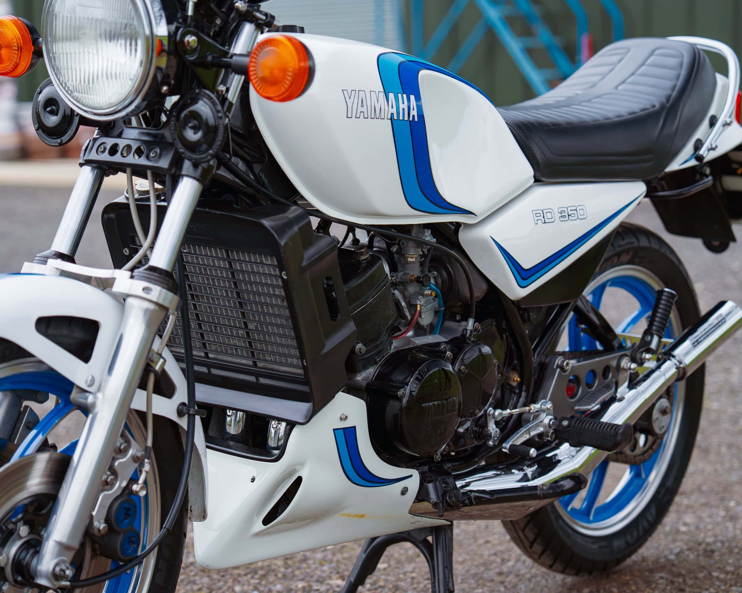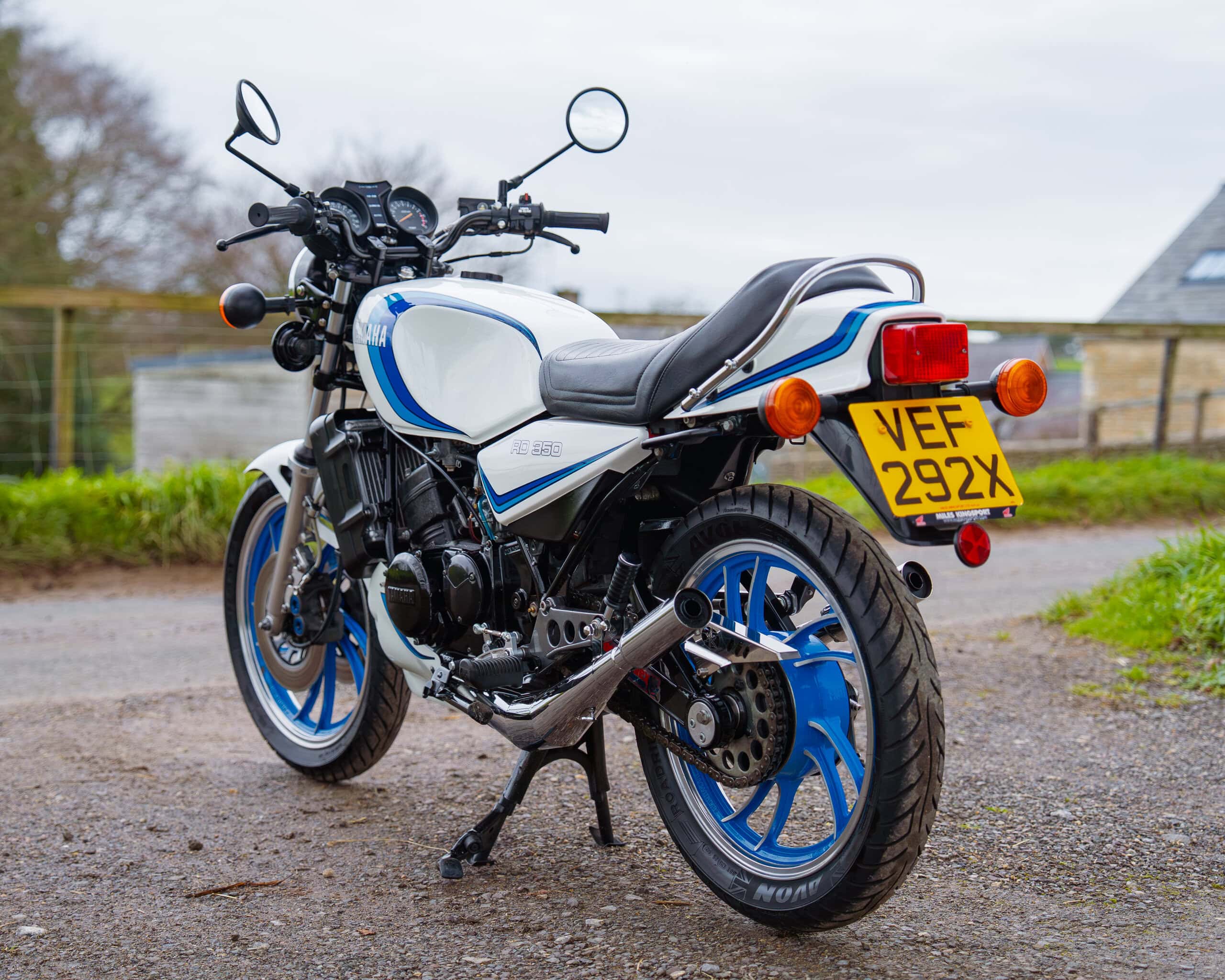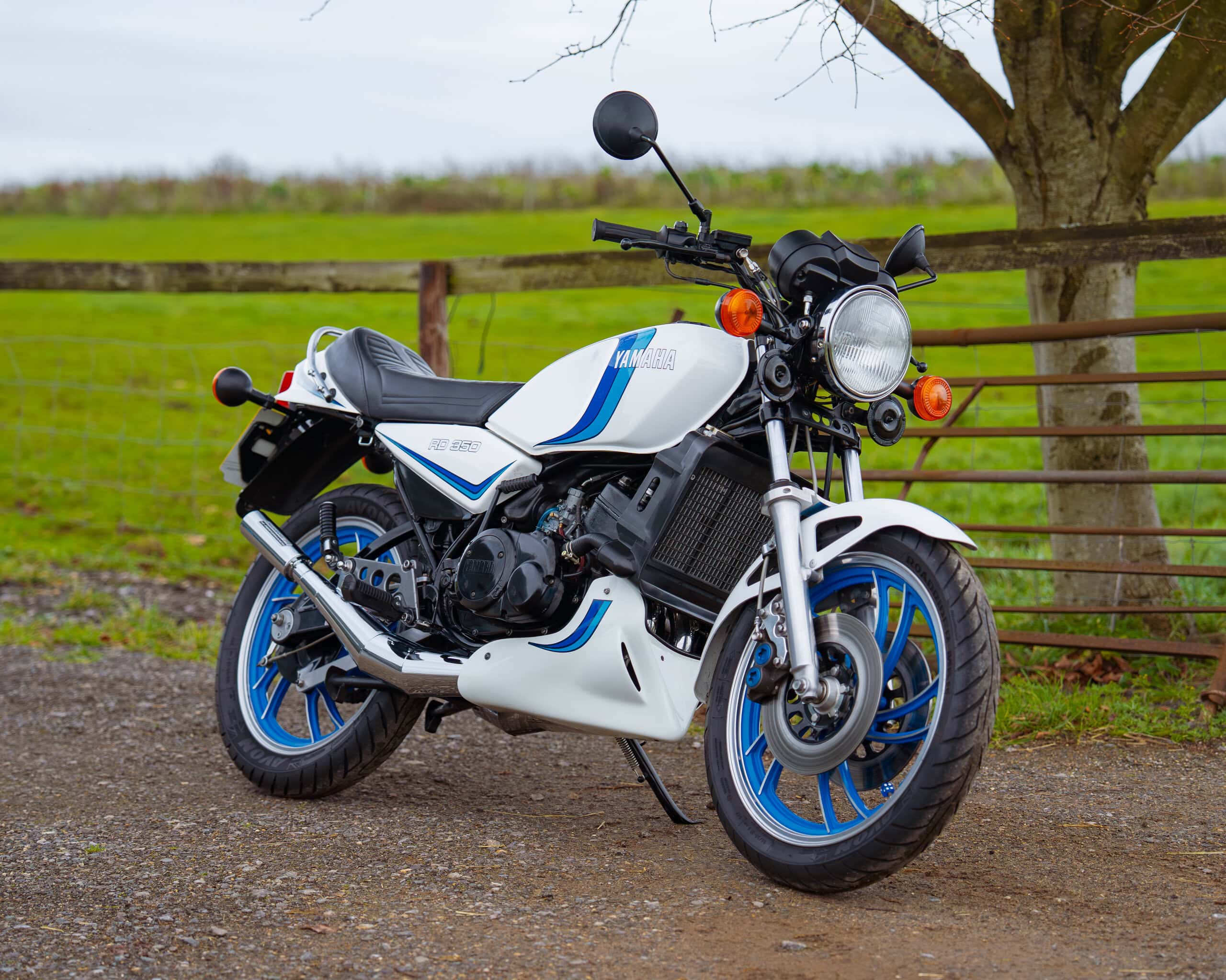 A lovely example of the iconic 1981 Yamaha RD350LC, fully rebuilt in 2013 with key electrical components renewed, including a new wiring loom, ignition coil, and CDI unit. This LC presents beautifully in the sought-after Bounty white-and-blue colour scheme, complemented by striking blue-painted wheels for a proper period look.